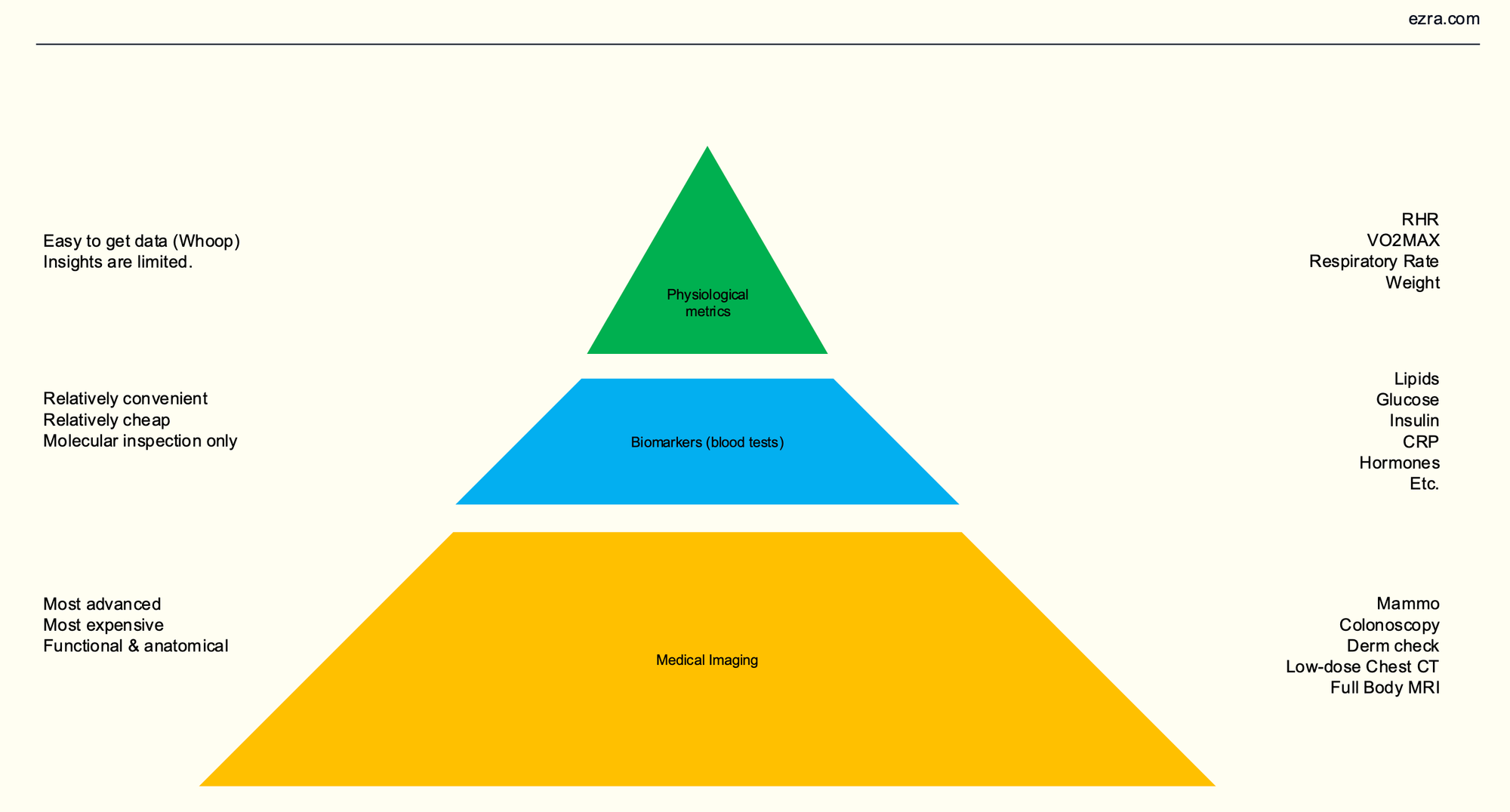 Moving to the middle of the pyramid, we have biomarkers collected through blood tests, such as lipids, glucose, insulin, CRP, hormones, and more. These markers are relatively easy to obtain, affordable, and very informative. However, blood tests only provide a snapshot at the molecular level, so they don't give a full picture of what’s happening inside the body.
